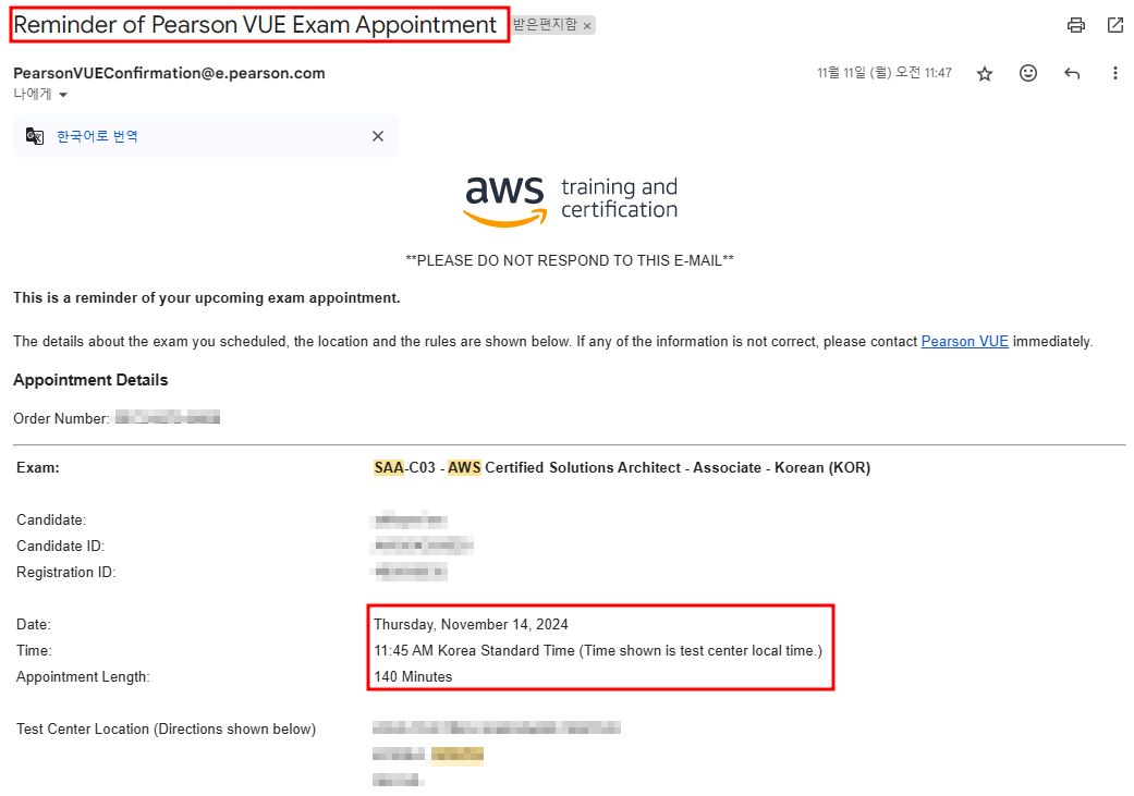 *AWS 시험 연기시에는 아래의 Reminder 수신 확인 必必必*